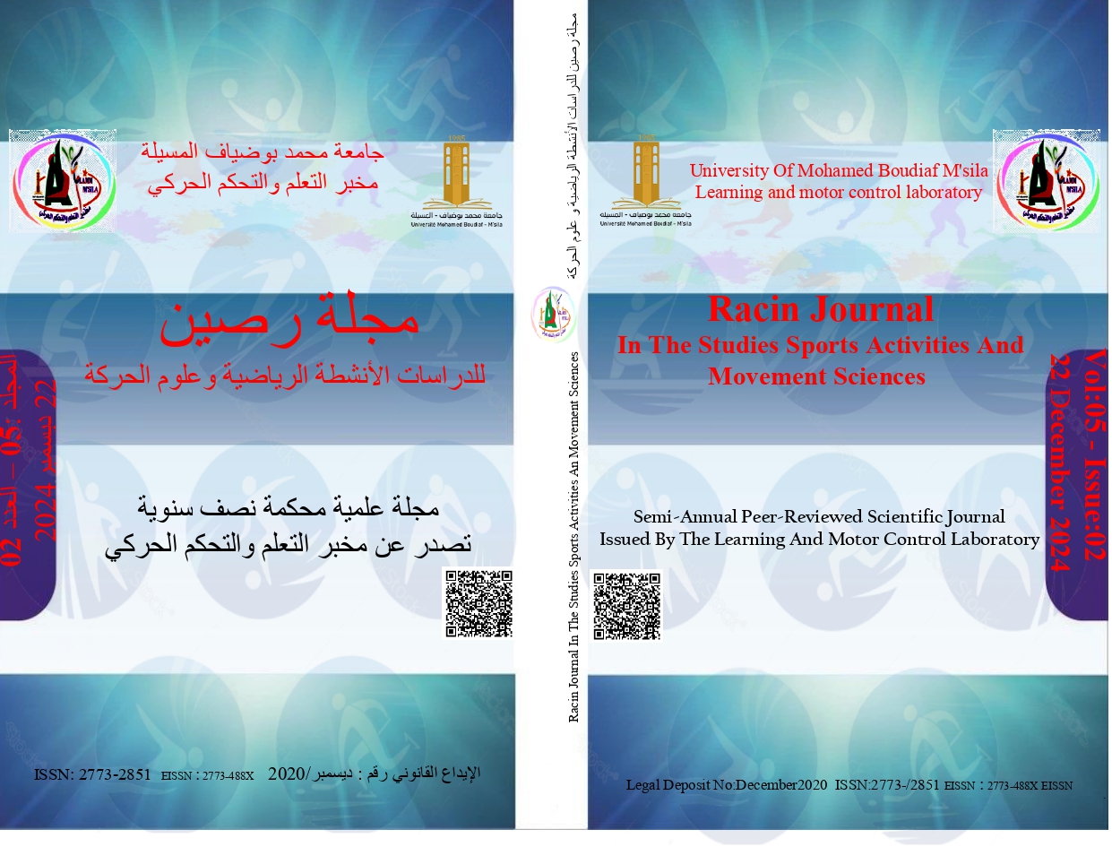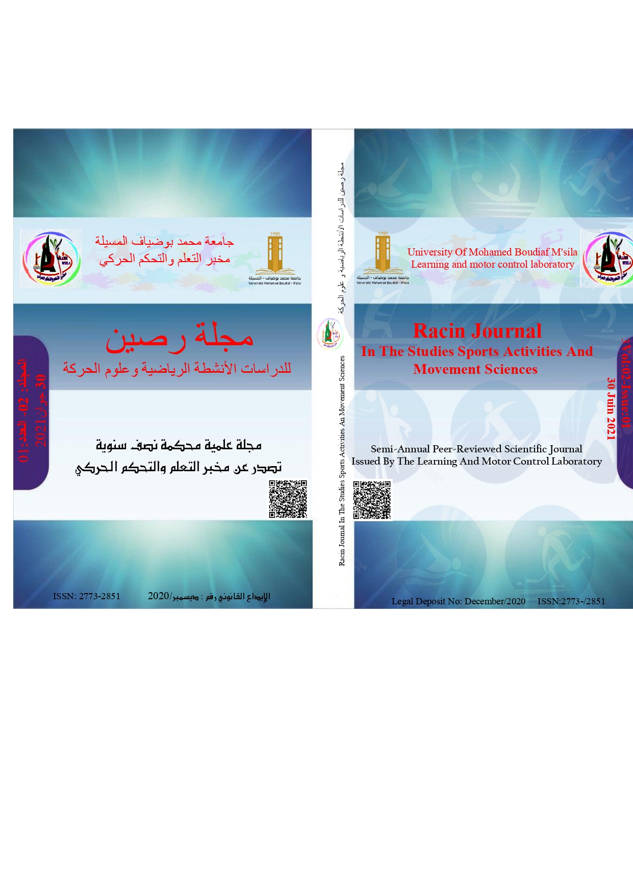 Vol. 5 No. 02 (2024)The Rasin Journal for Sports Activities and Movement Sciences is a semi-annual international scientific journal dedicated to publishing cutting-edge research and studies related to various topics and fields within the sciences and technologies of physical activities, sports, and movement sciences (psychological, educational, and social sciences; biomechanics; biological and medical sciences, etc.). The journal publishes innovative research in one of the aforementioned fields in Arabic with an abstract in English or French. Alternatively, the journal may publish research in either English or French with an Arabic abstract. The journal welcomes submissions from all researchers, professors, and graduate students, both within the country and abroad, who wish to publish their scientific work and research.