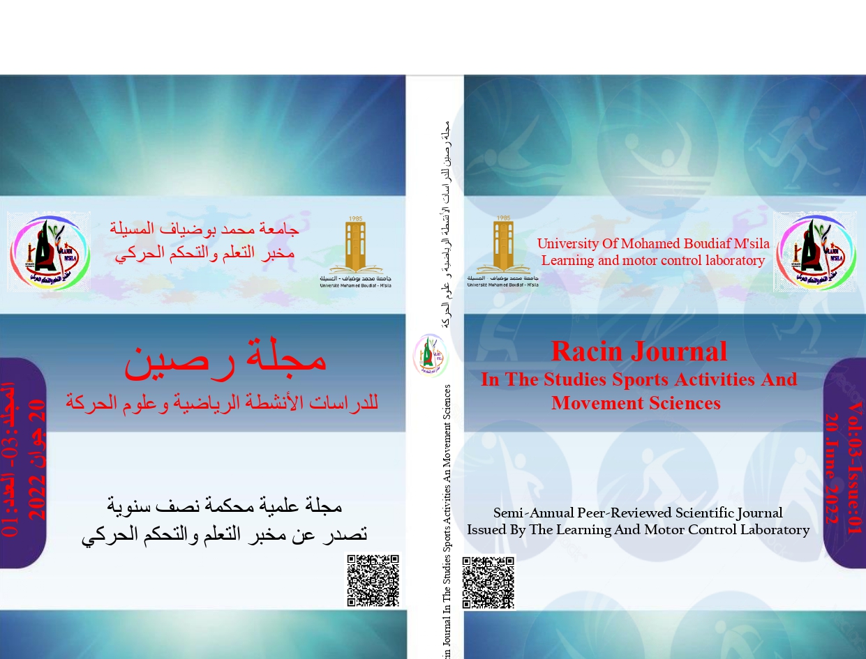 Vol. 3 No. 02 (2022)The Rasin Journal for Sports Activities and Movement Sciences is a semi-annual international scientific journal dedicated to publishing cutting-edge research and studies related to various topics and fields within the sciences and technologies of physical activities, sports, and movement sciences (psychological, educational, and social sciences; biomechanics; biological and medical sciences, etc.). The journal publishes innovative research in one of the aforementioned fields in Arabic with an abstract in English or French. Alternatively, the journal may publish research in either English or French with an Arabic abstract. The journal welcomes submissions from all researchers, professors, and graduate students, both within the country and abroad, who wish to publish their scientific work and research.